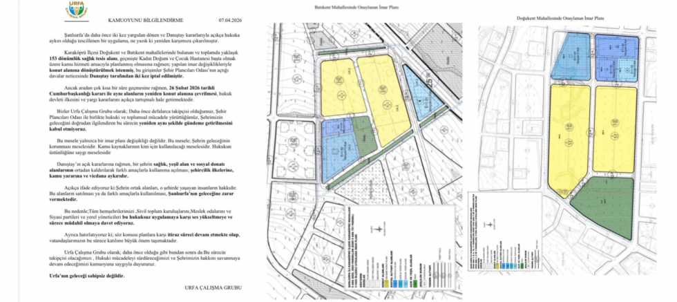 CHP Şanlıurfa İl Başkanı Ferhat Karadağ, Karaköprü’de Kadın Doğum ve Çocuk Hastanesi için ayrılan yaklaşık 101 dönümlük alan ile Batıkent Mahallesi’nde bulunan yaklaşık 52 dönümlük Sağlık Tesis Alanı’nın konuta dönüştürülmesine tepki gösterdi. Karadağ, söz konusu plan değişikliğinin şehircilik ilkelerine ve 3194 sayılı İmar Kanunu’na açıkça aykırı olduğunu ifade etti.